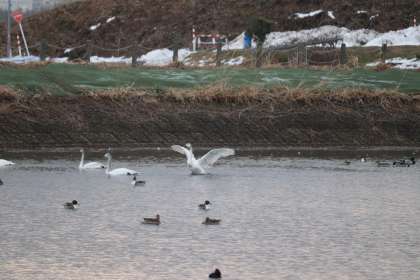 じっと観察していると、池の端に移動し、互いに首を上下する動きを見せる白鳥が7羽。「さあ、いくぞ」と1羽が羽を大きく開いた合図で、助走が始まりました。
