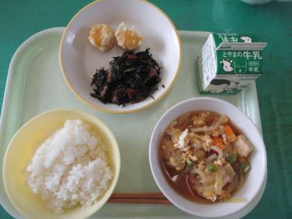 今日のメニューは、にんじんシューマイ、ひじきと小松菜の炒め煮、高野豆腐の卵とじ、牛乳でした。色鮮やかになるよう、丁寧に調理されています。