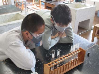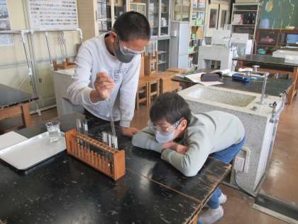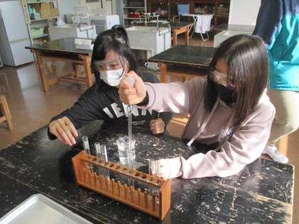 スチールウールとアルミニウムはくにうすい塩酸と炭酸水を注ぐとどうなるか、について調べました。小さな変化をも見逃さないようにと、じっくりと観察していました。