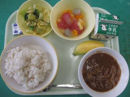 今日のメニューは、麦ご飯、ビーフストロガノフ、グリーンサラダ、フルーツミックス、ポケットチーズ、牛乳でした。こくのあるビーフストロガノフに、あっさりとしたサラダやフルーツミックスがとてもよくあいました。