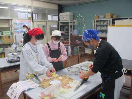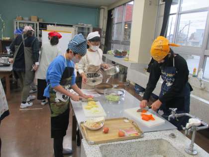 「豆腐と野菜のチャンプルー」と「ベーコンポテト」を調理実習で作りました。野菜を切っています。