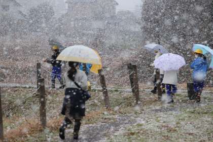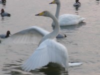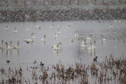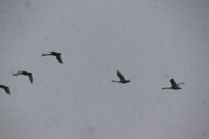 田尻池での活動は今日が最後となります。NHKの記者の方たちが取材に来てくださいました。池に着いた途端に雪が降り出し、既に飛び立った白鳥が上空からみんなを出迎えてくれました。