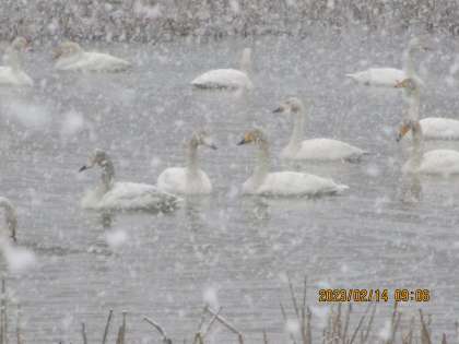 午前9時頃の白鳥の飛来数は43羽でした。今日は、たくさんの白鳥とカモが飛んでいる姿が見られました。バレンタインデーなので、ハートに見える白鳥を見ることができて嬉しかったです。