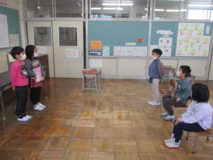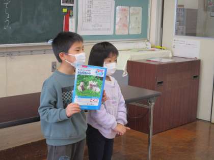 「これは、なんでしょう」の学習で、友達と問題作りをしました。お互いに問題を出し合っています。質問をしながら、どんどん答えに近付いていきました。