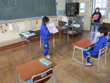 カウントダウンカードの紹介を朝の会で行っています。クラスの仲間に温かい言葉をかけている様子が見られ、気持ちよく一日の学校生活をスタートしています。