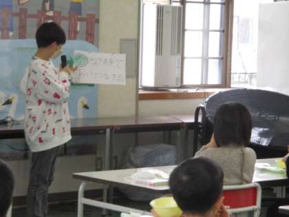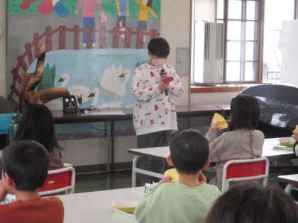 今日も、りんごの実に書かれた素敵なコメントが運営委員から発表されています。書いた子供も書かれた子供もとてもうれしそうです。また、挨拶の呼びかけも継続して行われています。