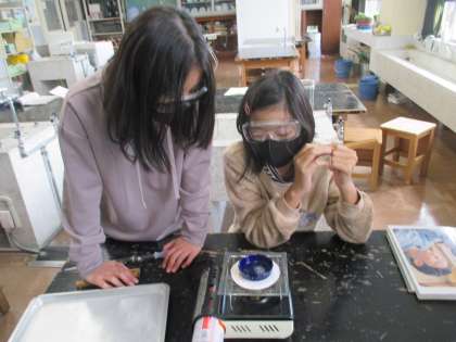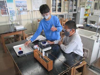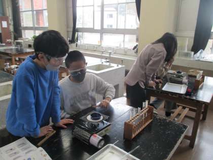 理科では、塩酸にスチールウールとアルミニウムはくが溶けた液を熱して水を蒸発させてみました。