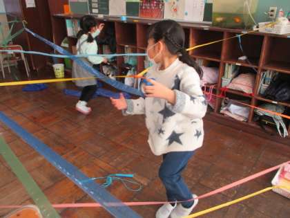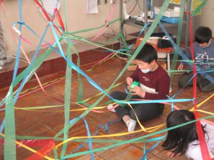 今日は「ひもひもワールド」をつくりました。どんどんひもを結んでいくといつも見慣れている教室が別の空間になっていきました。子供たちは不思議な感覚を楽しみながら造形遊びに取り組んでいました。