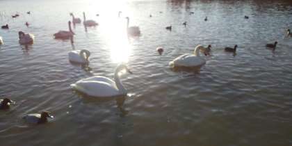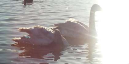 えさを食べた後、白鳥たちは優雅に浮かんでいます。