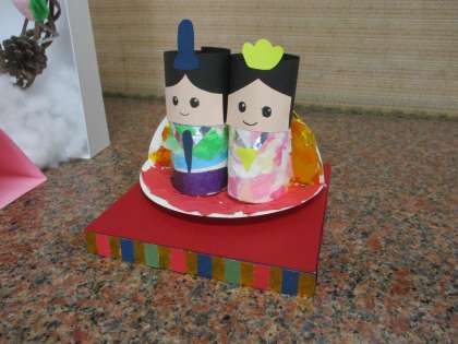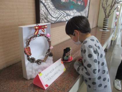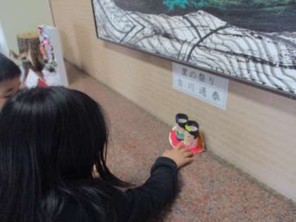 みんなで作ったお雛様を玄関に飾ってもらいました。たくさんの人に見てほしいと飾る場所や向きを相談して決めていました。