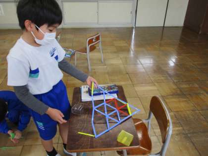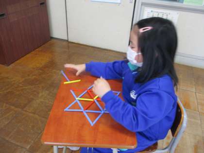 数え棒を使って形づくりをしています。三角形や四角形を作れることに気付き、それを組み合わせていろいろな形を作っていました。