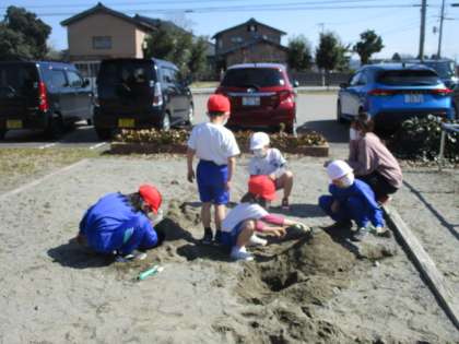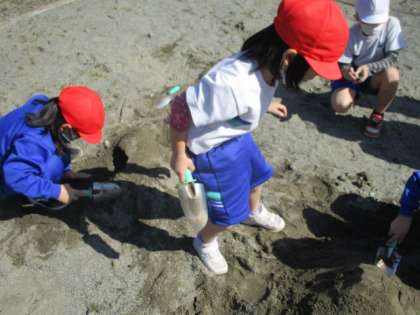 1年生は、砂場で楽しくアートづくりに励んでいます。
