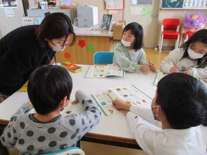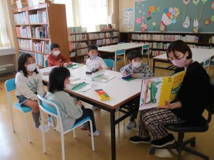 教科書に載っている本を図書室の先生に読み聞かせしてもらいました。「この本はありますか」と気になる本について進んで質問する子供たちです。