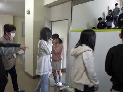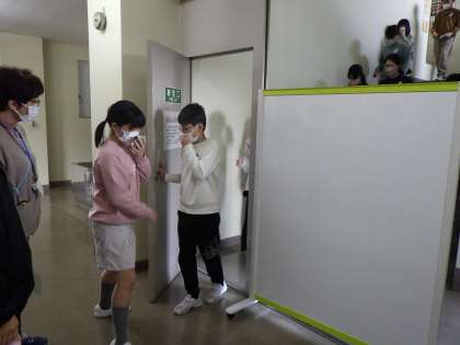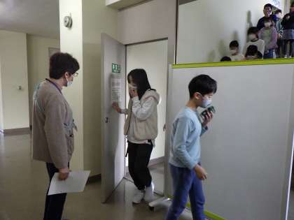 今回の避難訓練では、防火扉の通り方を確認しました。