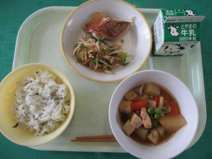 今日のメニューは、赤魚の塩焼き、いり大豆和え、鶏肉と根菜のごま煮、牛乳でした。さりげなく使われている大豆やごまの香りがおいしさを引き立てています。