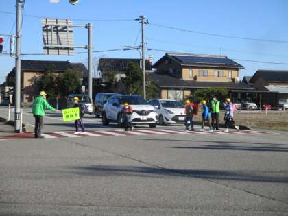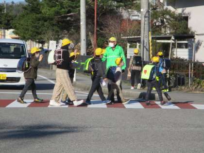 まぶしい朝日が子供たちを照らしています。地域の方々は、子供たちが安全に登校できるよう見守ってくださっています。