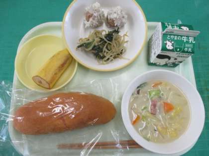 今日のメニューは、揚げパン、チンズワンズ、もやしとにらのソテー、白菜の中華クリーム煮、バナナ、牛乳でした。6年生にとって、今日の給食が小学校最後となりました。