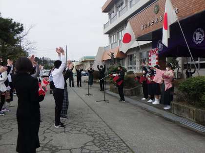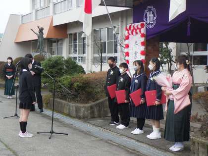 門出の式が、正面玄関前で行われました。在校生を代表して5年生の挨拶がありました。1年生から卒業生に花束を渡しました。