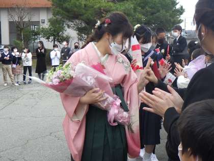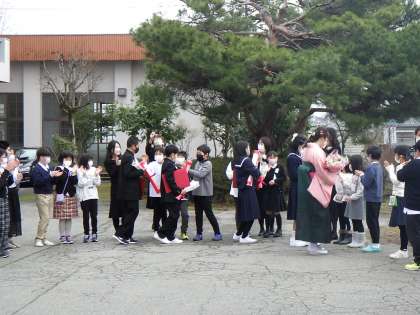 在校生が花道をつくり、卒業生を送りました。卒業生のみなさん、ご卒業おめでとうございます。中学校でも元気でがんばってください。