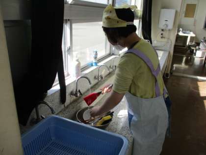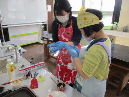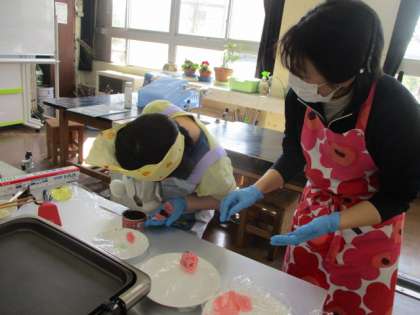 桜餅づくりに取り組んでいます。ピンクの皮にあんこをのせて、仕上げています。とてもおいしそうです。片付けもしっかりできましたね。