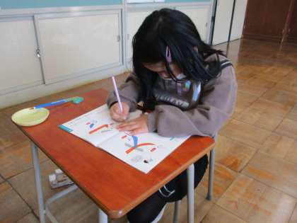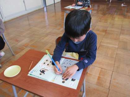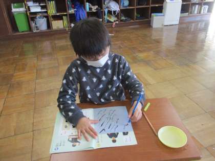 水筆を使って「とめ」や「はね」の確認をしています。水筆で気を付けたことを思い出しながら、鉛筆でも丁寧に書くことができました。