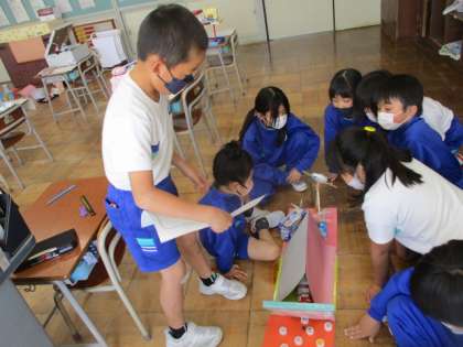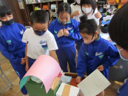 「ともだちハウス」の学習で、鑑賞会をしました。友達の作品のすてきなところ、おもしろいところを伝え合いました。