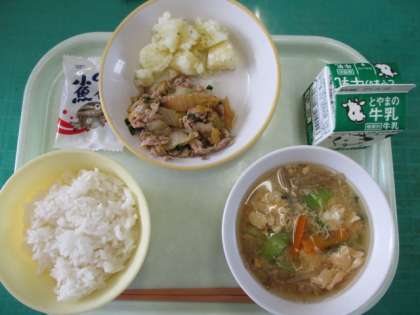 今日のメニューは、ご飯、豚肉のキムチ炒め、粉ふきいも、中華かき玉汁、味付け小魚、牛乳でした。一年間おいしい給食を食べることができて、とても幸せでしたね。