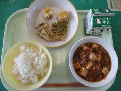 2〜6年生の給食が始まりました。今日のメニューは、ご飯、にんじんシューマイ、茎わかめのチョナムル、麻婆豆腐、牛乳でした。もりもり食べて、元気に過ごしていきましょう。