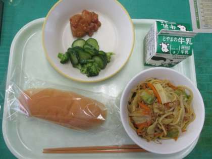 今日のメニューは、コッペパン、照り焼きチキン、えごまドレッシングサラダ、焼きそば、牛乳でした。みんなが大好きで、おいしく食べました。