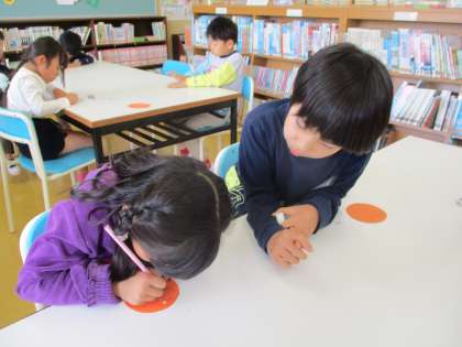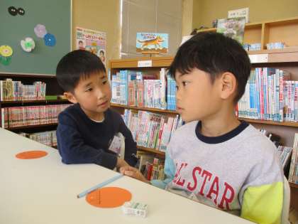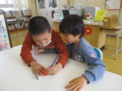 2年生に書き方やひらがなを教わりながら、初めてりんごの実を書いた1年生。自分や友達のよさを見つけることができました。