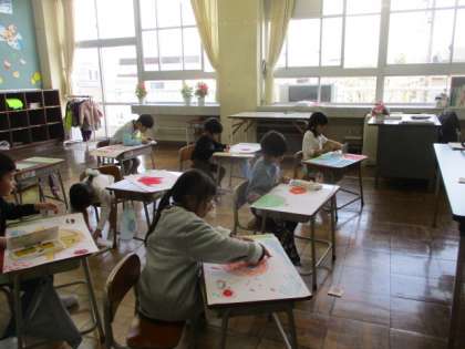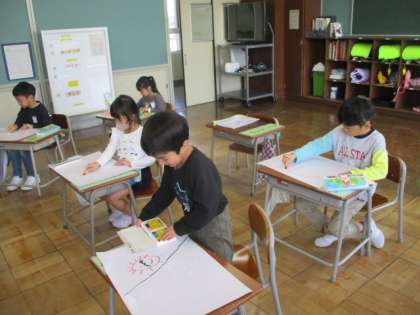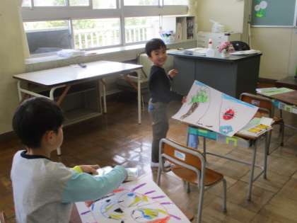 にこにこなお日さまを描いています。思い思いつぶやき、とても楽しそうです。