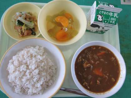 今日のメニューは、麦ご飯、カレー、福神和え、フルーツゼリーミックス、牛乳でした。コクのあるカレーライスとあっさりした和え物とゼリーです。子供たちは満足感でいっぱいです。