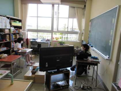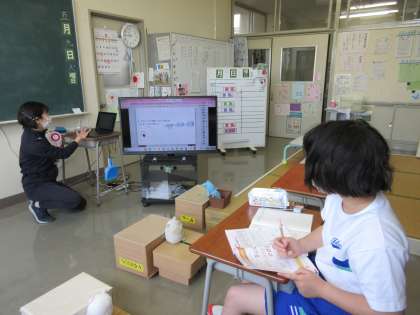 先生のお話を聞きながら、問題を解いています。モニターに映し出された図も確認し、頑張って学習に取り組んでいます。