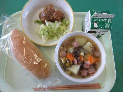 今日はサミット給食(ドイツ)でした。ライ麦パン、フリカデレ(ドイツ風一口ハンバーグ)、ザワークラウト(キャベツのつけもの)、アイントプフ(具だくさんスープ)、牛乳でした。ソースもスープもドイツ料理の味付けで、とてもおいしくいただきました。