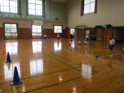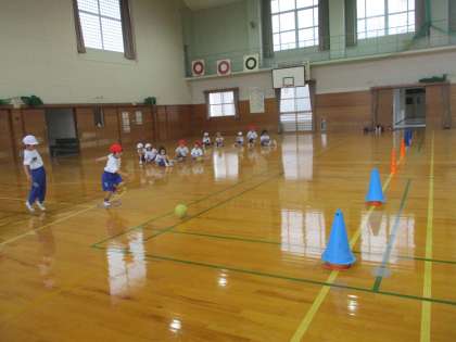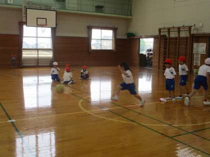 ボール蹴りに挑戦しました。いろいろな道具を使って思いっきり体を動かしています。
