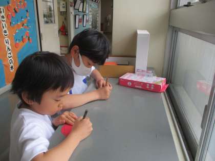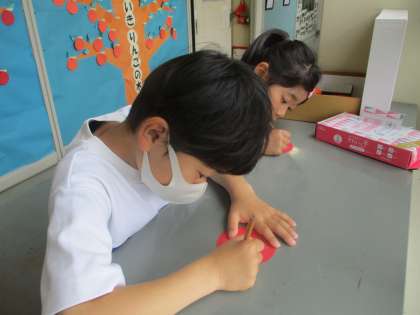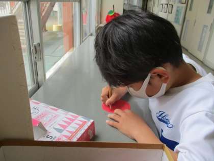 友達のよいところを見つけて進んでりんごの実を書くことができました。