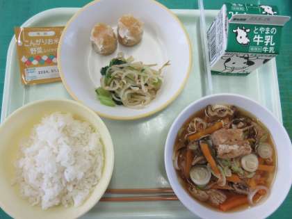 今日のメニューは、ご飯、にんじんシューマイ、おひたし、かやくうどん、野菜ふりかけ、牛乳でした。やさいたっぷりのうどんは、ちょっと涼しい日にはぴったりでした。