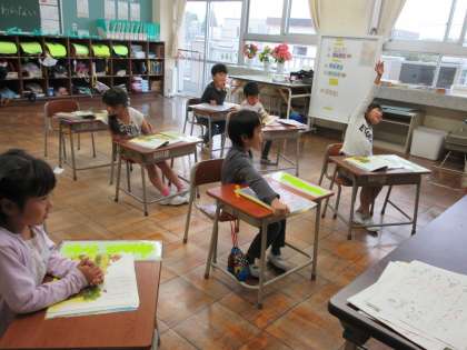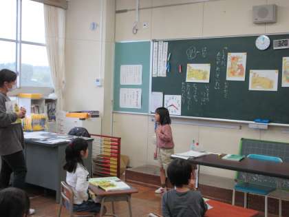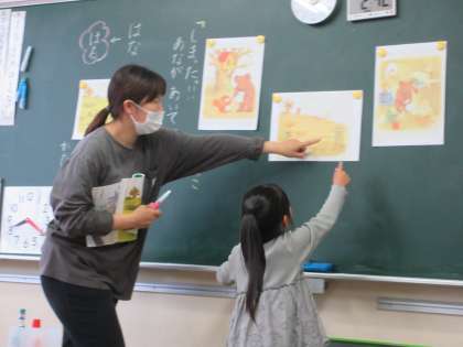 自分の思ったことを黒板の絵を示しながら、説明しています。みんなで聞いています。1年生、がんばっていますね。