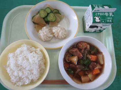 今日のメニューは、ご飯、えびパオツ、華風和え、酢豚、牛乳でした。たっぷりの甘酢あんの中に、野菜やお肉もごろごろ入っていてとてもおいしかったです。