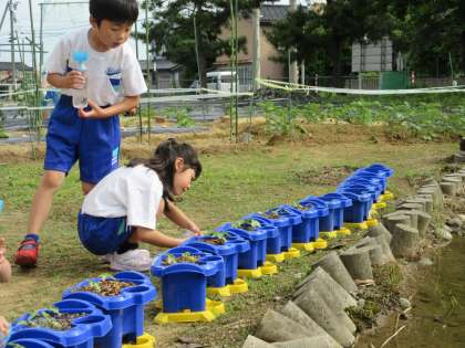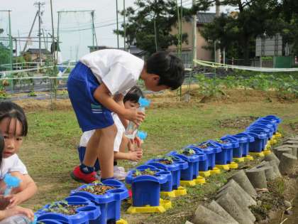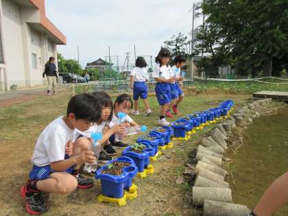 1、2年生が出てきたアサガオの芽に水やりをしています。