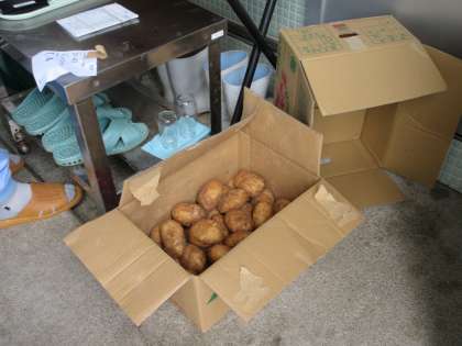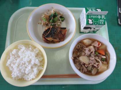 今日のメニューは、ご飯、さばの塩焼き、香味和え、豚肉の南蛮煮、牛乳でした。今朝、とても立派なじゃがいもを始め、食材が届けられていました。食べてみるとほくほくのじゃがいもでした。また、一味唐辛子や生姜、ねぎの風味が効いて、一層おいしさが引き立てられています。