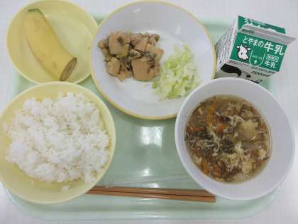 今日のメニューは、ご飯、あっさりチキン、添え野菜、卵ともずくのスープ、バナナ、牛乳でした。とろみのついたスープに、卵やもずくがとてもきれいに浮かんでいました。