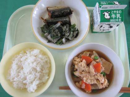 今日のメニューは、ご飯、さんまのマーマレード煮、よごし、卵とじ、牛乳でした。ごまと味噌、醤油のバランスがちょうどいいよごしは、ごはんにぴったりのおいしさでした。