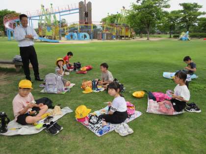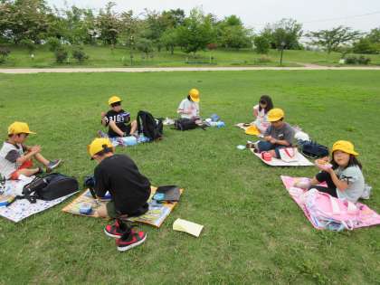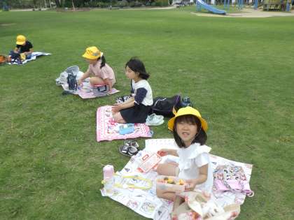 おとぎの森公園でお待ちかねのお弁当タイムです。みんなにこにこです。