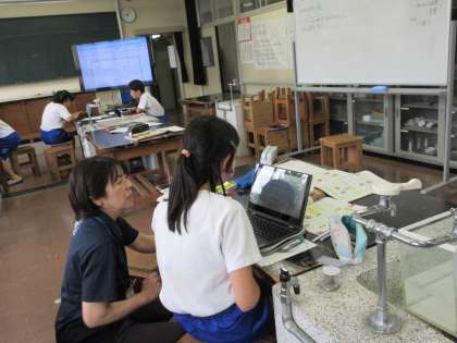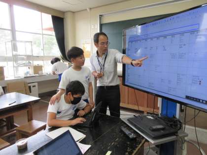 自分の考えをクロムブックに入力し、みんなで共有しています。