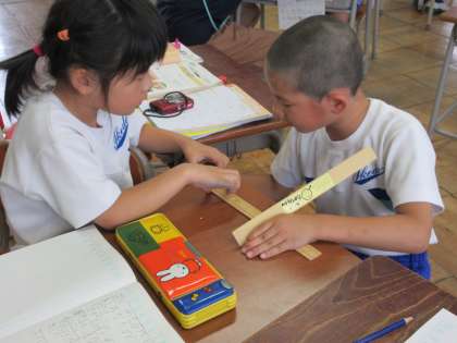 二人ペアになり、机の長さを測っています。細かいめもりをしっかりと見ています。