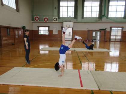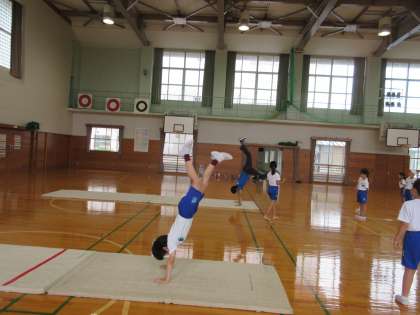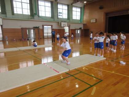 子供と先生の動きとシンクロしていました。のびのびとマット運動に取り組んでいます。