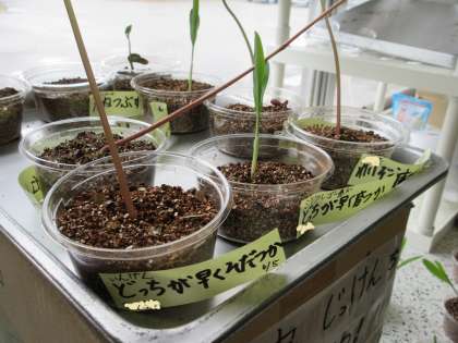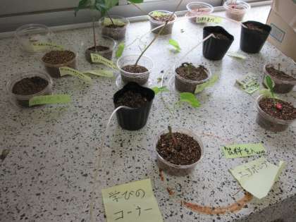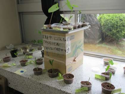 理科室には実験の経過がよく分かる植物がたくさん置かれています。継続して観察し、データをとっています。どんなことが分かってきたでしょうか。