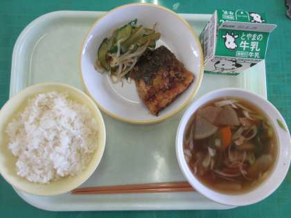 今日のメニューは、かみかみ献立でした。ご飯、魚の梅風味かば焼き、茎わかめの中華和え、根菜スープ、牛乳です。ごぼう、にんじん、茎わかめ等、よくかんで味わっていただきました。