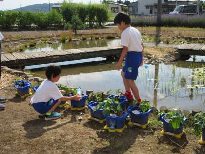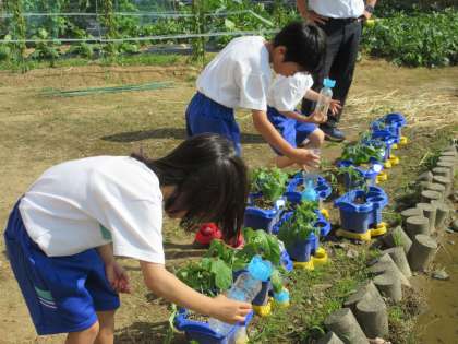 「大きくなあれ」と声をかけ、たっぷり水を与えています。